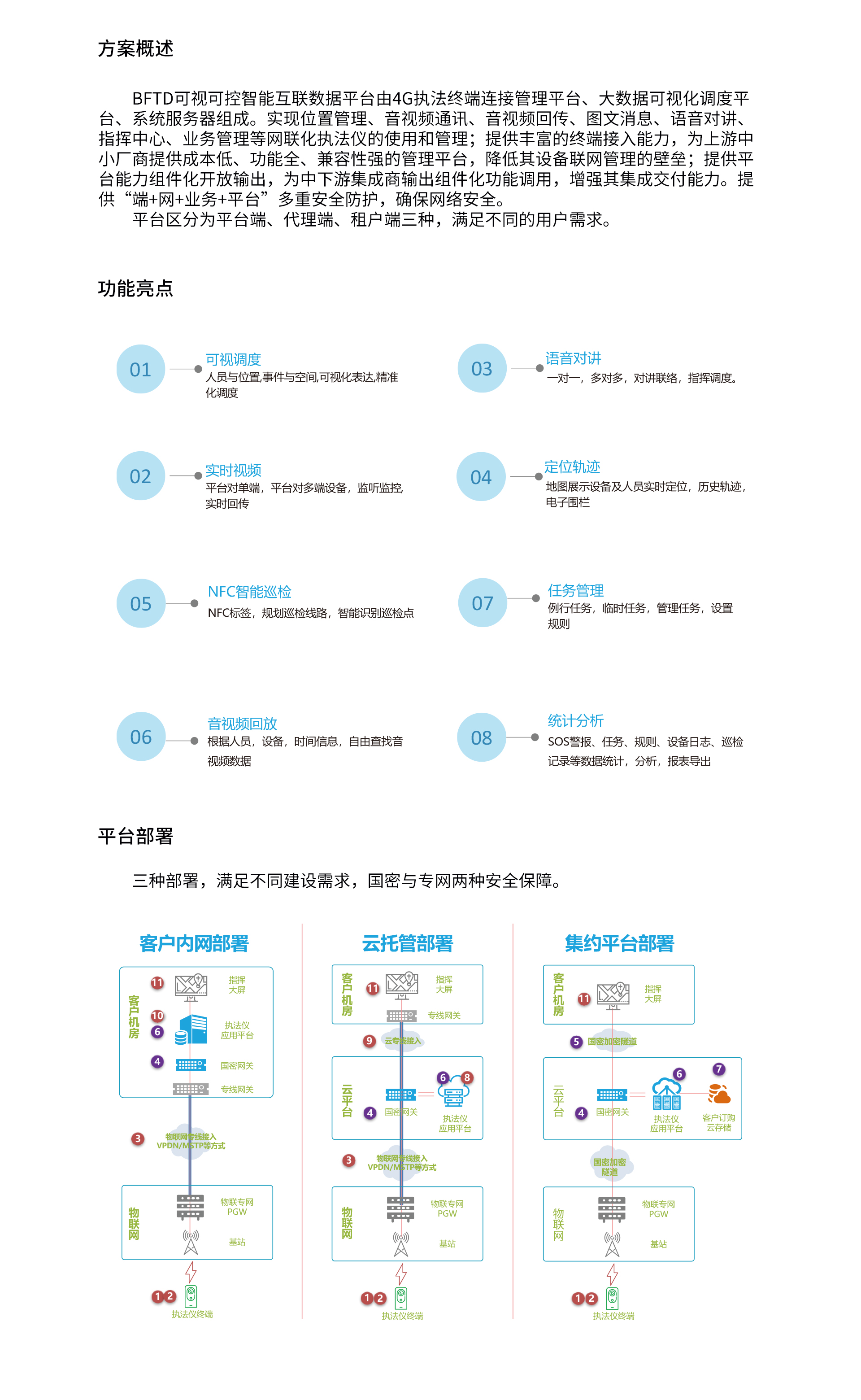 BFTD可視可控智能互聯數據平臺由4G執法終端連接管理平臺、大數據可視化調度平臺、系統服務器組成。實現位置管理、音視頻通訊、音視頻回傳、圖文消息、語音對講、指揮中心、業務管理等網聯化執法儀的使用和管理;提供豐富的終端接入能力,為上游中小廠商提供成本低、功能全、兼容性強的管理平臺,降低其設備聯網管理的壁壘;提供平臺能力組件化開放輸出,為中下游集成商輸出組件化功能調用,增強其集成交付能力。提供“端+網+業務+平臺”多重安全防護,確保網絡安全。